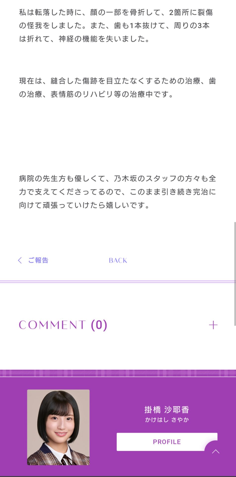 昨年8月29日に東京・神宮球場で行われたライブで負傷し、治療に専念するため休業している乃木坂46掛橋沙耶香(20)が2日、自身のブログを更新し、けがの詳細を説明した。掛橋は「今日は私の怪我について、ファンの皆さんにご心配の声をいただくことも多いとお聞きしておりますので、スタッフさんと相談して、皆さんに怪我の詳細をお伝えすることにしました」とし、「転落した時に、顔の一部を骨折して、2箇所に裂傷の怪我をしました。また、歯も1本抜けて、周りの3本は折れて、神経の機能を失いました」と報告。現状について「縫合した傷跡を目立たなくするための治療、歯の治療、表情筋のリハビリ等の治療中です。病院の先生方も優しくて、乃木坂のスタッフの方々も全力で支えてくださってるので、このまま引き続き完治に向けて頑張っていけたら嬉しいです」とつづっている。